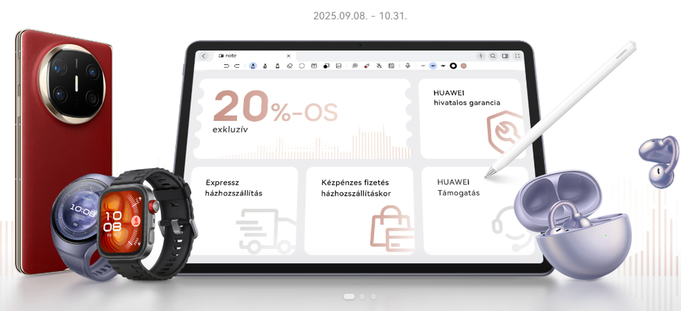 2025. szeptember 8. és október 31. között a Huawei szinte teljes ökoszisztémájára kiterjeszti a promóciókat. Az ügyfelek akár 25% kedvezményre számíthatnak okosóráknál, fitneszszalagoknál, táblagépeknél, okostelefonoknál és kiegészítőknél. Kiállított eszközök közé tartoznak a Huawei Watch 5, Watch GT 5 Pro, MatePad Pro 12.2 és a Pura 70 okostelefonok. A hangrajongók szintén kedvezményeket élvezhetnek a FreeBuds Pro 4, FreeBuds 6i és FreeClip modellek esetében. Ezek a kedvezmények lehetővé teszik a felhasználók számára, hogy könnyebben építsenek egy csatlakoztatott Huawei setupot csökkentett költséggel.